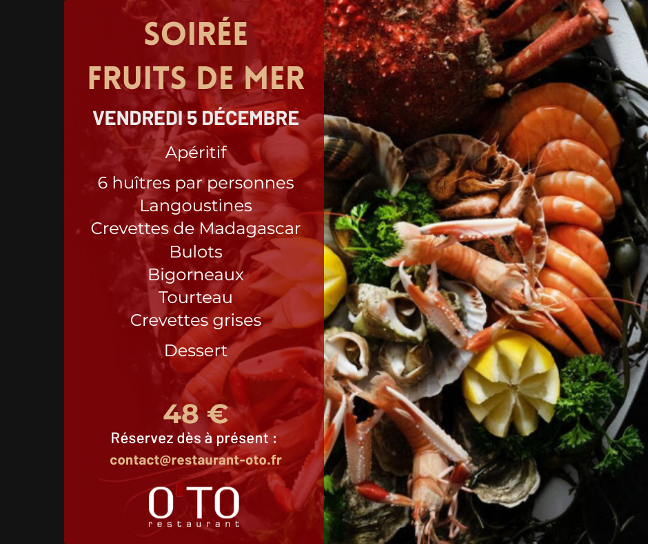 Le Restaurant O’to à Cholet vous invite à une soirée exceptionnelle dédiée aux fruits de mer le vendredi 5 décembre.